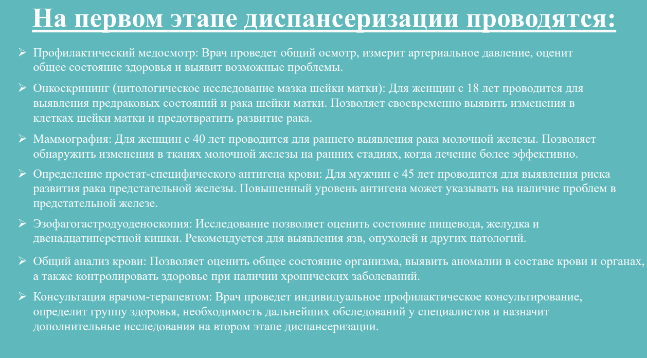 Процедура проводится бесплатно по полису ОМС. Эти меры направлены на сохранение здоровья, повышение качества и продолжительности активной жизни населения, что соответствует целям национального проекта «Продолжительная и активная жизнь» Всю информацию вы можете узнать в подготовленных для вас карточках.